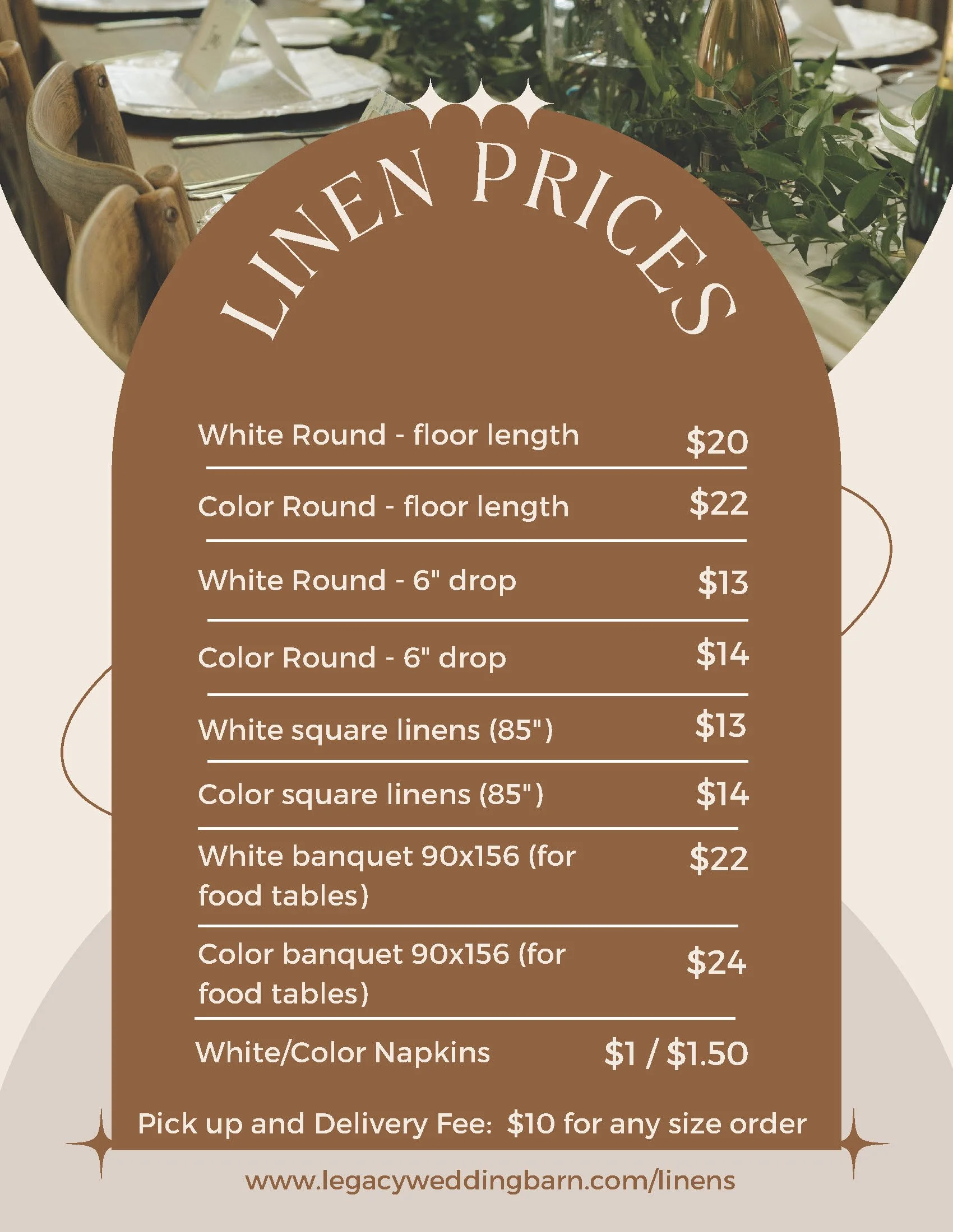 Table Linen Service Bride and Groom's Names * Date of wedding: MM DD YYYY Email * # of White Round - floor length ($20) # of Color Round - floor length ($22) How many and what color? # of White round 6" drop ($13) # of Color round 6" drop ($14) How many and what color? # of White 85" Square ($13) # Color 85" Square ($14) How many and what color? # of White Banquet (food tables) 90x156 ($22) # of Color Banquet (food tables) 90x156 ($24) How many and what color? # of White Napkins ($1.00) # of Colored Napkins ($1.50) How many and what color? By entering my name below, I understand that I am renting linens through The Legacy Barn. They will be delivered the week of my wedding. I also doublechecked my count of each item. My invoice will be updated and the payment will be due either with my final payment or in a separate invoice. * Thank you! Your invoice will be updated and sent to you soon.
